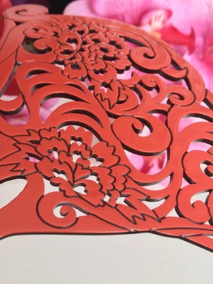 Red on the surface, the material inside sandwiches black plates for a three-dimensional feel.