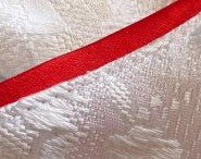 The white kimono is the pinnacle of formal attire, only worn by brides. Made from the same material as a white kimono, this mask features an akafuki (red decoration), said to ward off disaster. Thin lines were included to retain the image of the bright red used in temple gates.