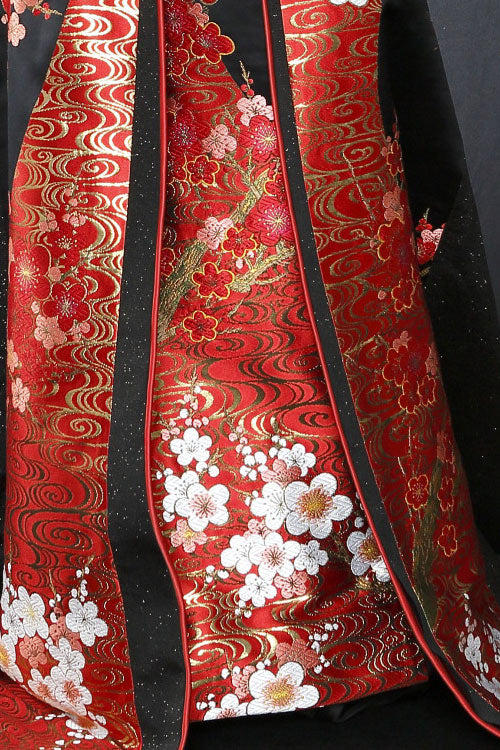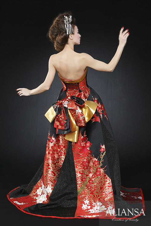 A dress made of the popular plum blossom patterned material, equivalent to wearing an Uchikake kimono. The combination of a slender underskirt and a voluminous overdress is inspired by the Japanese wedding kimono.