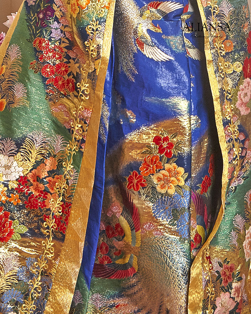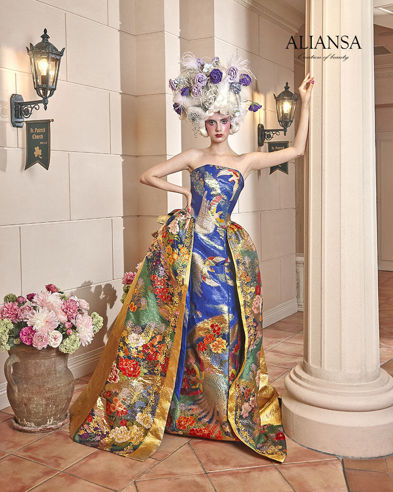 A dress made of Uchikake kimono fabric inspired by oriental princess dresses. The design is emphasized with tucks to give the waist a slimmer look. We kept the vibe of the colorful Uchikake kimono and made it into a dress.