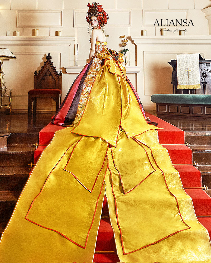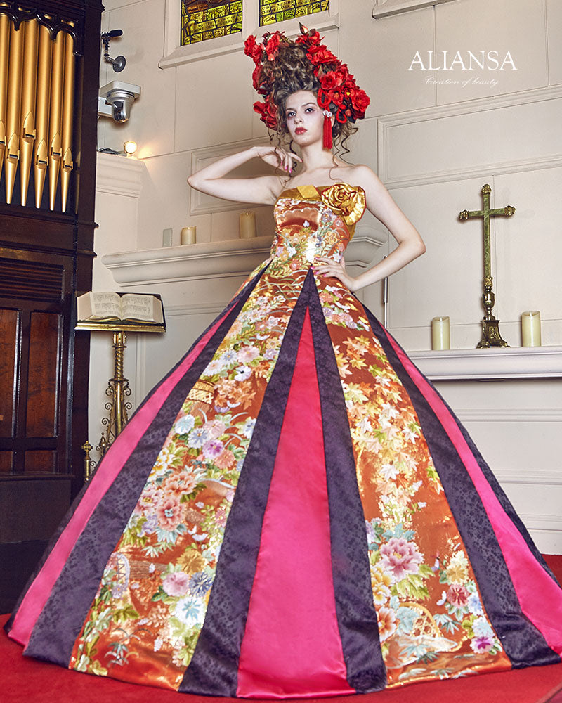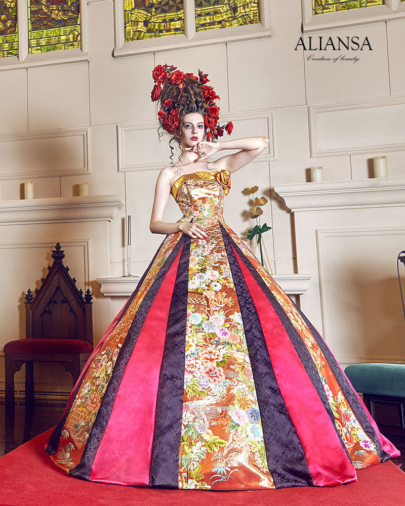 The pattern is carefully hand-embroidered, displaying the grace of the dress. The color scheme of bright pink and deep purple gives the dress a lovely yet elegant look. The long golden train makes customization even more gorgeous possible.