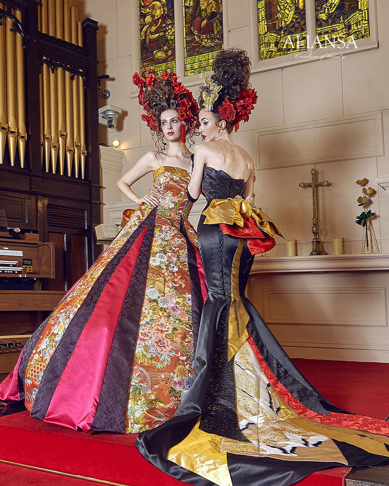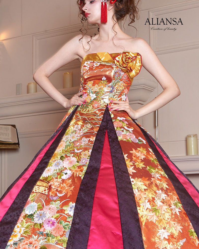 A beautiful dress with a banquet of chrysanthemums, Momiji, bellflowers, and other Japanese autumnal grasses, as well as peonies and plum blossoms that signify spring and other flowers of the four seasons.