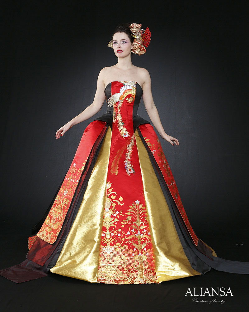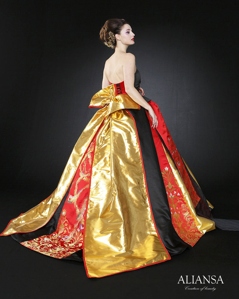 A dress with peacock weave patterns and oriental flowers blooming on bright red fabric and gold embellishments—truly a dress for the star of the event. Designed with extra volume at the mid-hip, it gives the waist a slimmer look.